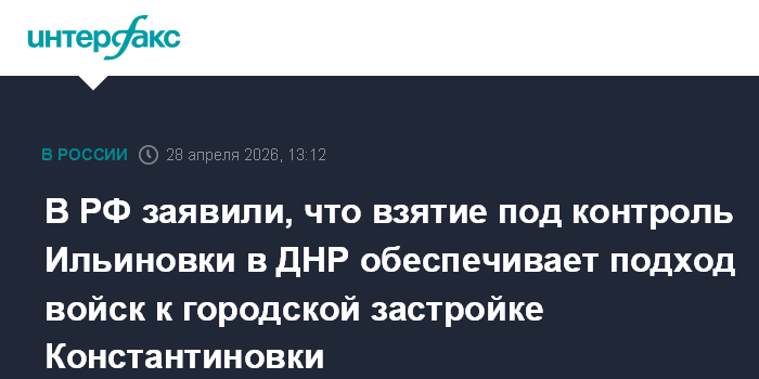 Москва. 28 апреля. INTERFAX.RU - Переход под контроль "Южной" группировки войск села Ильиновка в ДНР обеспечивает подход российских подразделений к городской застройке Константиновки с юго-запада, заявили в Минобороны России во вторник.