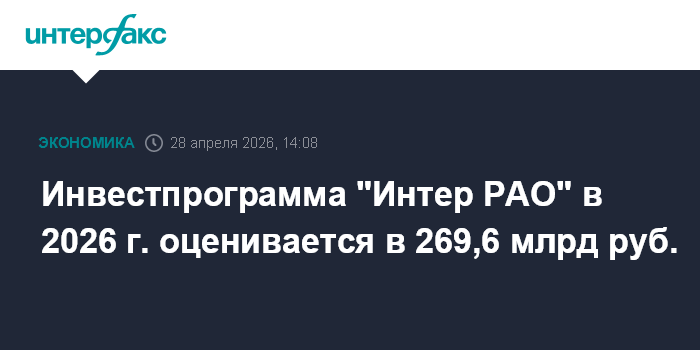 Москва. 28 апреля. INTERFAX.RU - Инвестпрограмма ПАО "Интер РАО" в 2026 г. оценивается в 269,6 млрд руб., из них 123,9 млрд руб. планируется направить на новое строительство, говорится в проекте годового отчета компании за 2025 г.