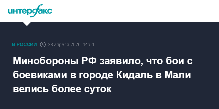 Москва. 28 апреля. INTERFAX.RU - Отряд "Африканского корпуса" более суток вел бои с боевиками в городе Кидаль, военнослужащие вооруженных сил Мали и "Африканского корпуса" покинули этот опорный пункт, заявили в Минобороны РФ во вторник.