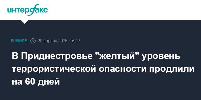 Москва. 28 апреля. INTERFAX.RU - В Приднестровье "желтый", повышенный уровень террористической опасности продлен на 60 дней, до 2 июля. Такой указ об этом подписал лидер непризнанной республики Вадим Красносельский с учетом "сохраняющейся угрозы совершения террористического акта".