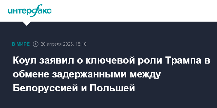 Москва. 28 апреля. INTERFAX.RU - Спецпосланник американского президента по Белоруссии Джон Коул заявил, что США и непосредственно Дональд Трамп играют ключевую роль в произошедшем 28 апреля обмене задержанными по формуле "пять на пять" на границе Белоруссии и Польши.