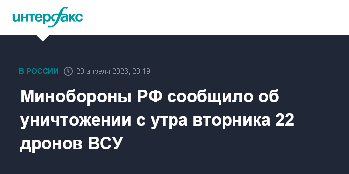 Москва. 28 апреля. INTERFAX.RU - Российские военные сбили 22 украинских беспилотника с 8:00 до 20:00 вторника, сообщило Минобороны РФ.