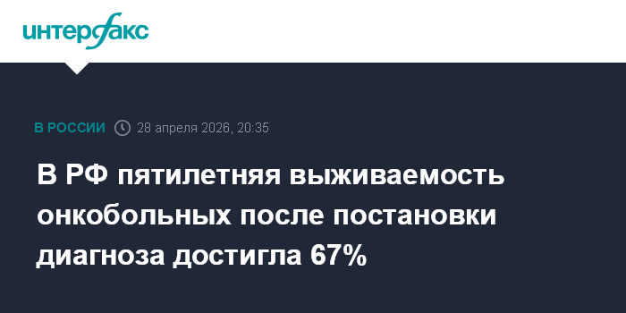Москва. 28 апреля. INTERFAX.RU - Министр здравоохранения РФ Михаил Мурашко сообщил об историческом максимуме - 67% заболевших онкологическим заболеванием выживают в течение пяти лет с момента постановки диагноза.