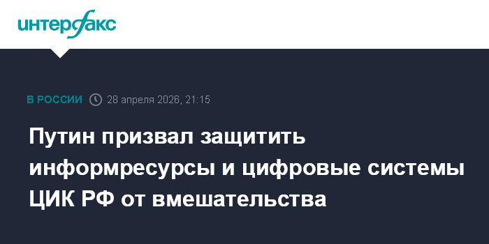 Москва. 28 апреля. INTERFAX.RU - Президент РФ Владимир Путин поручил надежно защитить государственные информационные ресурсы и цифровые системы ЦИК от любого постороннего вмешательства как до, так и во время выборов.