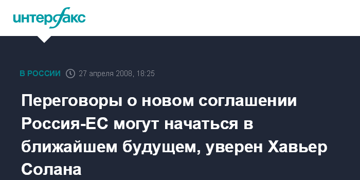 Брюссель. 28 апреля. ИНТЕРФАКС - Европейский Союз и Россия в ближайшем будущем смогут приступить к переговорам о новом соглашении о сотрудничестве, которое заменит Соглашение о партнерстве и сотрудничестве 1994 года, заявил в интервью "Интерфаксу" верховный представитель ЕС по единой внешней политике и политике безопасности Хавьер Солана.