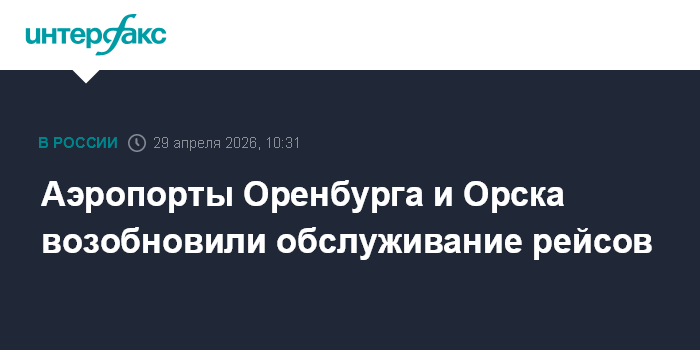 Москва. 29 апреля. INTERFAX.RU - Аэропорты Оренбурга и Орска вернулись к штатной работе после снятия введенных в ночь на среду ограничений, сообщает Росавиация в канале в Мах.