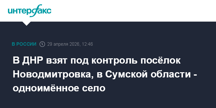 Москва. 29 апреля. INTERFAX.RU - Вооружённые силы России взяли под контроль посёлок Новодмитровка в ДНР и одноимённое село в Сумской области, сообщило в среду министерство обороны РФ.