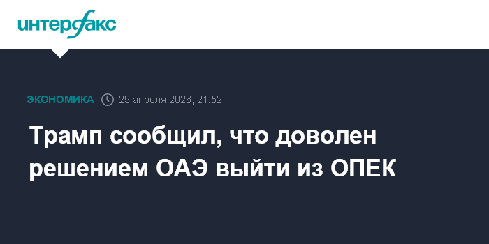 Москва. 29 апреля. INTERFAX.RU - Президент США Дональд Трамп заявил в среду, что положительно относится к решению Объединенных Арабских Эмиратов выйти из ОПЕК.