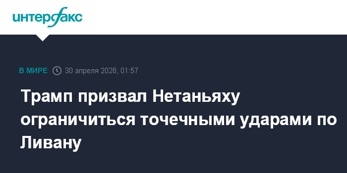 Москва. 30 апреля. INTERFAX.RU - Президент США Дональд Трамп заявил израильскому премьер-министру Израиля Биньямину Нетаньяху, что Израиль должен предпринимать только точечные удары в Ливане и избегать полного возобновления военных действий.