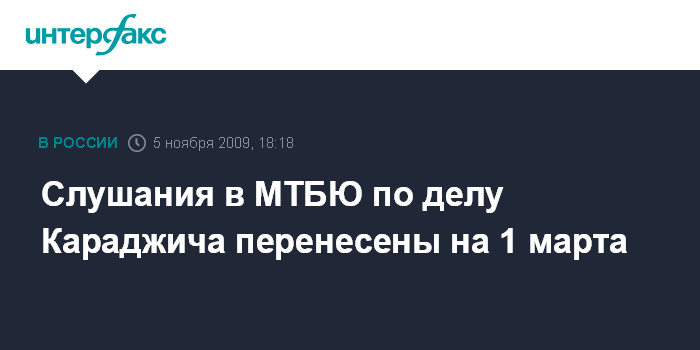 Гаага. 5 ноября. INTERFAX.RU - Международный трибунал по бывшей Югославии в четверг объявил о переносе на 1 марта 2010 г. слушаний по делу бывшего лидера боснийских сербов Радована Караджича.