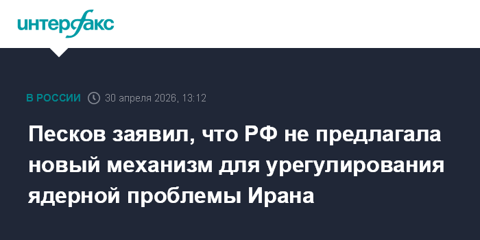 Москва. 30 апреля. INTERFAX.RU - Россия не предлагала создавать новый механизм для урегулирования иранской ядерной проблемы, аналогичный ранее действовавшему Совместному всеобъемлющему плану действий (СВПД) 2015 года, заявил пресс-секретарь президента РФ Дмитрий Песков.