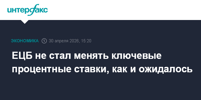 Москва. 30 апреля. INTERFAX.RU - Европейский центральный банк (ЕЦБ) сохранил основные процентные ставки на прежних уровнях по итогам апрельского заседания, завершившегося в четверг.