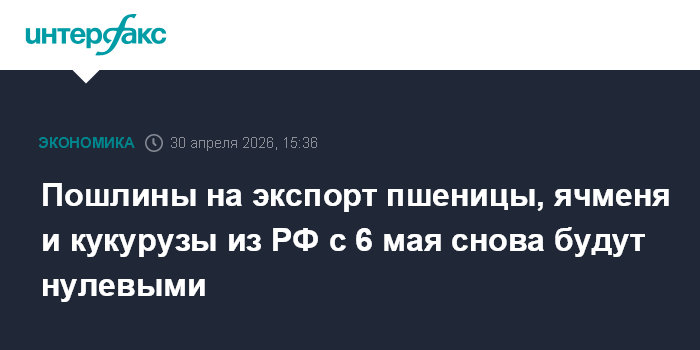 Москва. 30 апреля. INTERFAX.RU - Ставки пошлин на экспорт пшеницы, ячменя и кукурузы с 6 мая третью неделю подряд будут нулевыми, сообщает Минсельхоз.