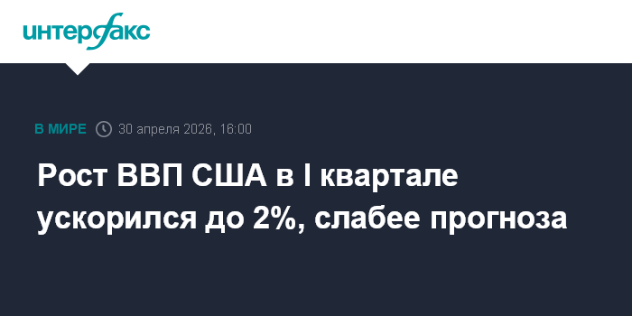 Москва. 30 апреля. INTERFAX.RU - Экономика США в первом квартале 2026 года увеличилась на 2% в пересчете на годовые темпы, сообщило министерство торговли страны.