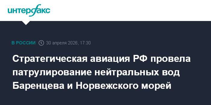 Москва. 30 апреля. INTERFAX.RU - Российские стратегические бомбардировщики-ракетоносцы Ту-95МС выполнили плановый семичасовой полет над нейтральными водами Баренцева и Норвежского морей, сообщило Минобороны РФ в четверг.