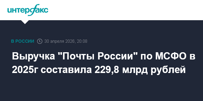 Москва. 30 апреля. INTERFAX.RU - Выручка АО "Почта России" по МСФО в 2025 году составила 229,8 млрд рублей, что на 0,1% больше, чем в 2024 году, говорится в отчетности компании.