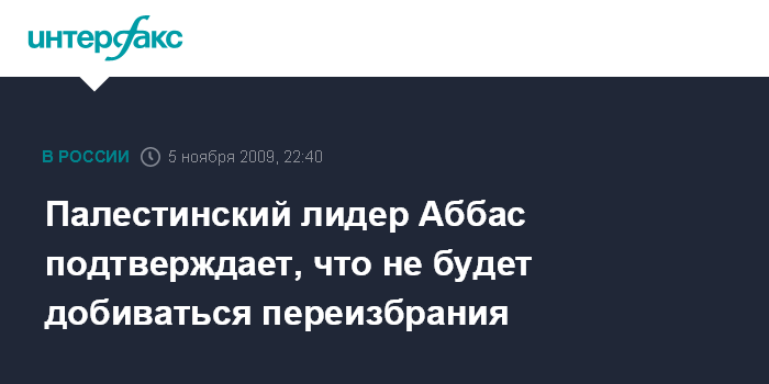 Иерусалим. 5 ноября. ИНТЕРФАКС - Глава Палестинской национальной администрации Махмуд Аббас подтвердил в четверг, что не собирается добиваться переизбрания на выборах, намеченных на 24 января.