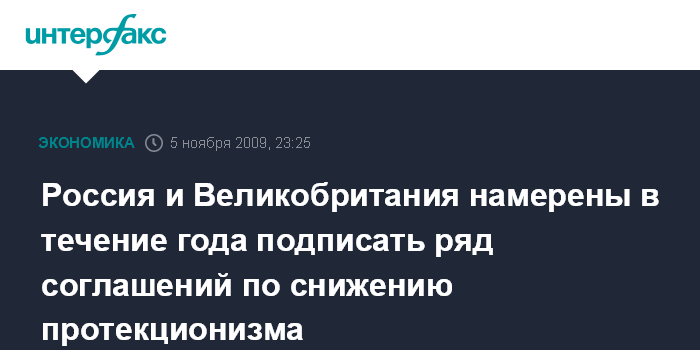 Лондон. 5 ноября. ИНТЕРФАКС-АФИ - Россия и Великобритания намерены в течение года подписать ряд соглашений, которые будут способствовать выходу обеих стран из кризиса, а также снижению различных барьеров, в том числе, протекционистских.