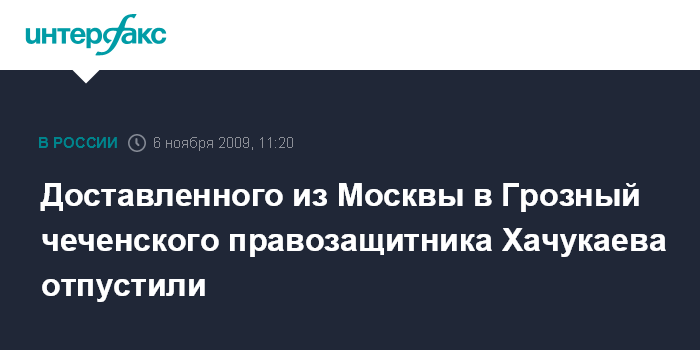 Москва. 6 ноября. INTERFAX.RU – Глава неправительственной организации из Грозного "Право" Арби Хачукаев, который ранее на этой неделе был задержан в Москве и отправлен в Чечню, отпущен на свободу.