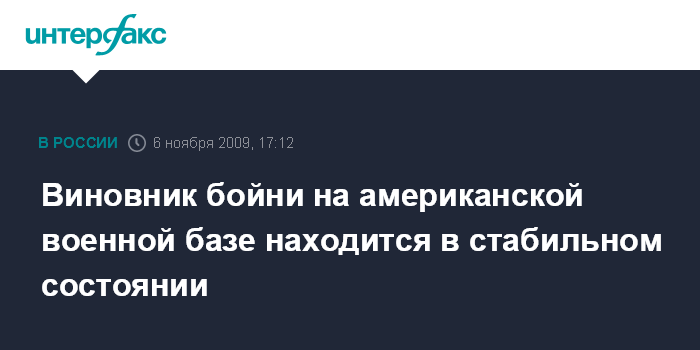 Вашингтон. 6 ноября. INTERFAX.RU - Майор Нидаль Малик Хасан, устроивший стрельбу на военной базе Форт-Худ в американском штате Техас, находится в стабильном состоянии, сообщает американская телекомпания CNN со ссылкой на врачей из военного госпиталя базы.