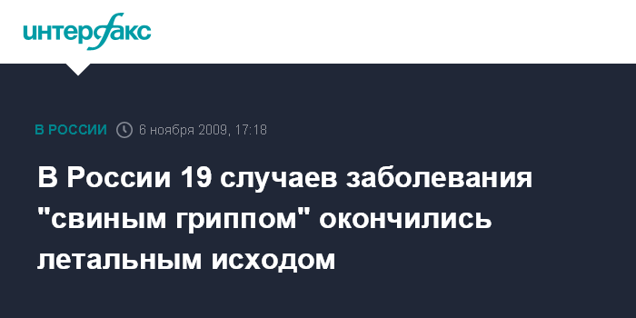 Москва. 6 ноября. INTERFAX.RU - В России зарегистрировано 19 смертельных случаев от свиного гриппа, сообщает Роспотребнадзор.
