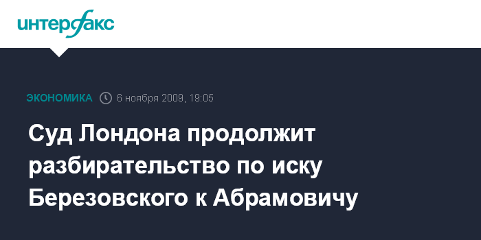 Лондон. 6 ноября. ИНТЕРФАКС - Коммерческий суд Лондона в понедельник, 9 ноября продолжит разбирательство по иску Бориса Березовского к Роману Абрамовичу.