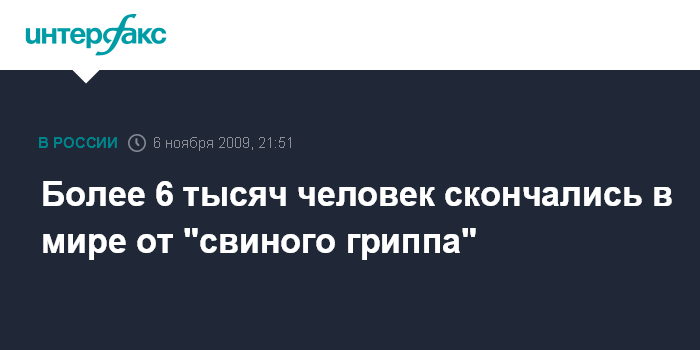 Женева. 6 ноября. INTERFAX.RU - В мире 6 071 человек скончался в результате заражения вирусом A/H1N1, сообщается в заявлении, распространенном в пятницу Всемирной организацией здравоохранения (ВОЗ).