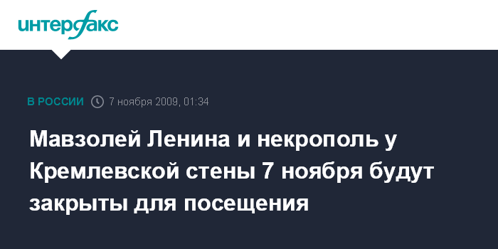Москва. 7 ноября. ИНТЕРФАКС - Допуск посетителей в мавзолей Ленина и к некрополю у Кремлевской стены в субботу, 7 ноября, осуществляться не будет.