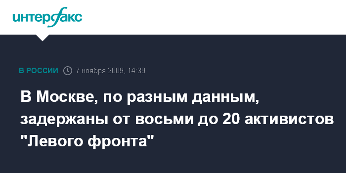 Москва. 7 ноября. INTERFAX.RU - Двадцать активистов движения "Левый фронт" были задержаны в Москве после митинга, организованного КПРФ, сообщила "Интерфаксу" в субботу пресс-секретарь "Левого фронта" Анастасия Удальцова.