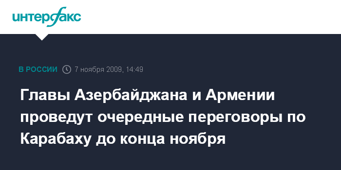 Москва. 7 ноября. INTERFAX.RU - Президенты Азербайджана и Армении приняли предложение сопредседателей Минской группы ОБСЕ по проведению очередного, шестого раунда переговоров по карабахскому урегулированию до конца ноября, говорится в заявлении посредников по итогам их визита в регион 4-6 ноября.