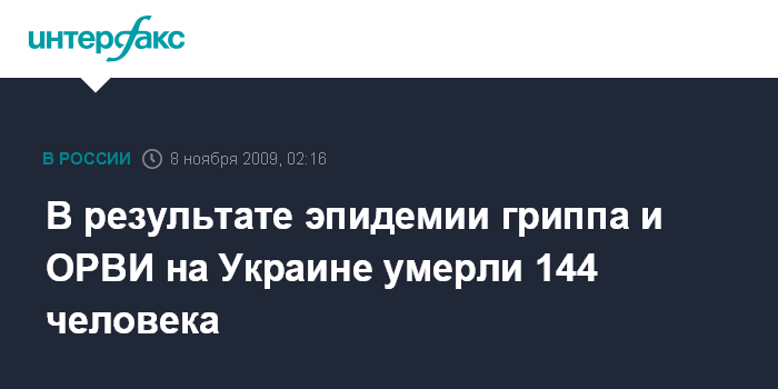 Киев. 8 ноября. ИНТЕРФАКС-УКРАИНА - На Украине по состоянию на 7 ноября от гриппа и ОРВИ умерли 144 человека, сообщает Министерство охраны здоровья Украины в воскресенье.