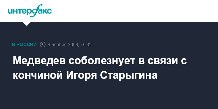 Москва. 8 ноября. INTERFAX.RU - Президент РФ Дмитрий Медведев выразил соболезнования родным и близким актера театра и кино Игоря Старыгина в связи с его кончиной, сообщила пресс-секретарь главы государства Наталья Тимакова.