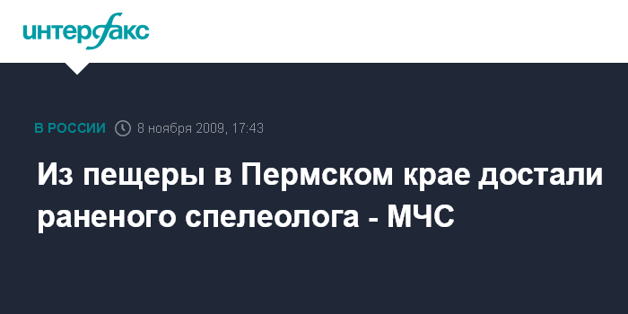 Пермь. 8 ноября. INTERFAX.RU - Из пещеры "Российская" в Пермском крае, где в воскресенье в результате обвала погибли два спелеолога и еще двое были ранены, подняли на поверхность пострадавшего мужчину, сообщили агентству "Интерфакс-Поволжье" в пресс-службе главного управления МЧС РФ по Пермскому краю. "Он госпитализирован. Состояние средней степени тяжести", - отметили в пресс-службе.