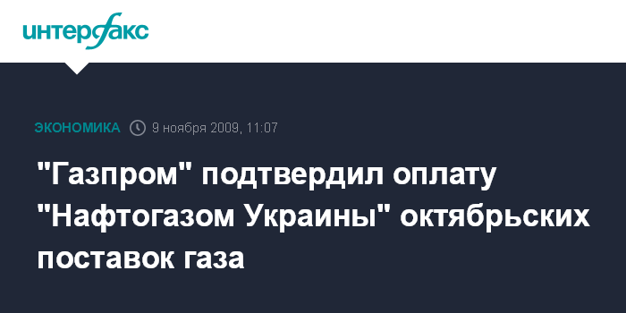 Москва. 9 ноября. INTERFAX.RU – "Нафтогаз Украины" в полном объеме оплатил октябрьские поставки газа, сообщили журналистам в управлении информации ОАО "Газпром".