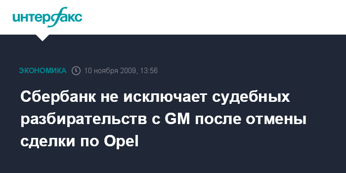 Москва. 10 ноября. INTERFAX.RU - Сбербанк РФ не исключает судебных разбирательств с General Motors (GM) после отмены сделки по Opel, сообщил президент - председатель правления банка Герман Греф журналистам в Петербурге во вторник.