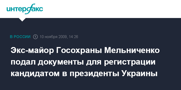 Москва. 10 ноября. INTERFAX.RU - Бывший майор Государственной охраны Николай Мельниченко подал документы в Центральную избирательную комиссию для регистрации кандидатом в президенты Украины.