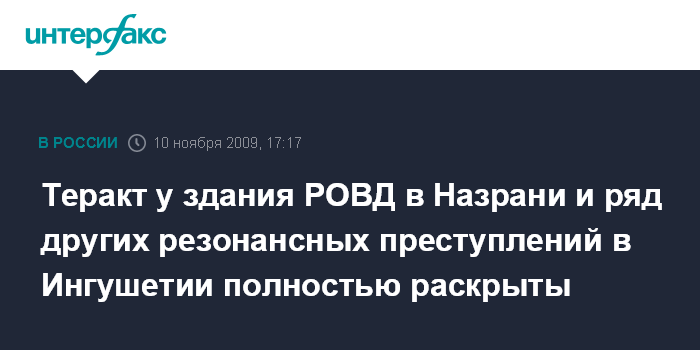 "Такие преступления, как покушение, организованное в отношении меня в июне этого года, теракт у здания РОВД в Назрани, убийство зампреда Верховного суда республики и еще ряд крупных и резонансных покушений и террористических актов можно считать фактически раскрытыми", - заявил глава Ингушетии.