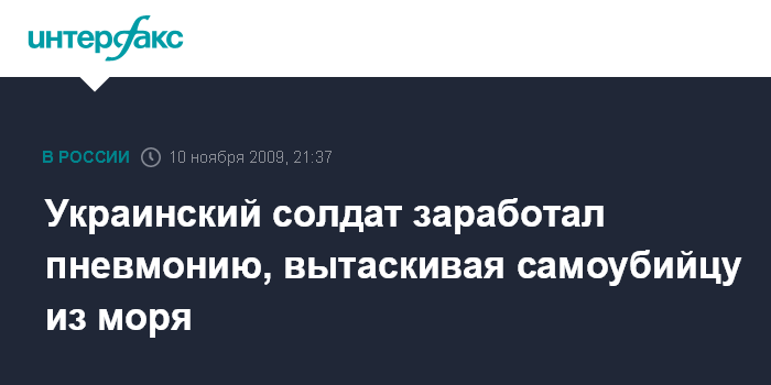 Москва. 10 ноября. INTERFAX.RU - Старший лейтенант внутренних войск МВД Украины 24-летний Дмитрий Гомбал на Одесском пляже Ланжерон спас мужчину, который бросился в море, привязав к себе кусок плиты. Сам военнослужащий госпитализирован с пневмонией.