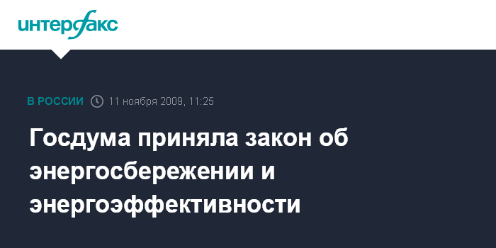 Москва. 11 ноября. INTERFAX.RU – Госдума на заседании в среду приняла в третьем, окончательном, чтении закон "Об энергосбережении и о повышении энергетической эффективности и о внесении изменений в отдельные законодательные акты РФ".