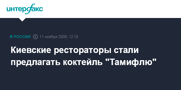 Москва. 11 ноября. INTERFAX.RU – В одном из киевских ресторанов на Андреевском спуске в меню появился коктейль "Тамифлю". Как пишет "Газета по-киевски" в среду, о новинке можно узнать из вывески перед входом в заведение.