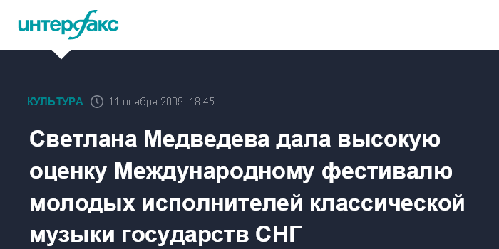Москва. 11 ноября. INTERFAX.RU - Международный фестиваль молодых исполнителей классической музыки государств СНГ "Восходящие звезды в Кремле" стал серьезным шагом для расширения гуманитарного сотрудничества на пространстве содружества, считает супруга президента РФ Светлана Медведева.