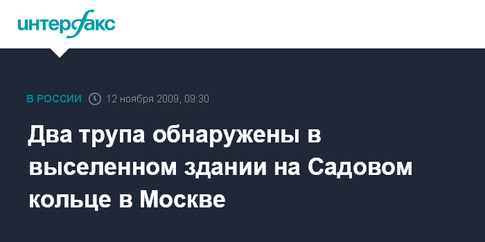 Около 19:30 в выселенном здании, подготовленном к сносу, по адресу Садовая-Триумфальная, дом 14, было обнаружено два трупа. Один из погибших - 28-летний неработающий житель Москвы. Ему было нанесено восемь резано-рубленых ран в области головы и шеи. Рядом с ним была обнаружена женщина 20-25 лет, личность которой пока не установлена. Предположительно мужчину зарубили топором, а женщину избили.