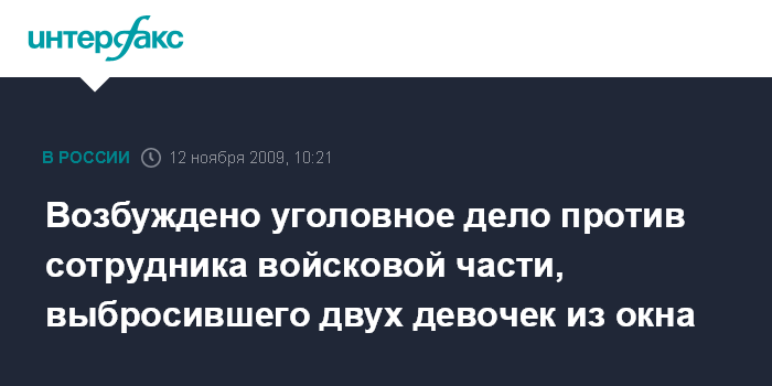 Москва. 12 ноября. INTERFAX.RU - В СКП РФ подтверждают факт возбуждения уголовного дела по статье "Убийство" в отношении сотрудника войсковой части, выбросившего в ночь на четверг из окна двух восьмилетних девочек.