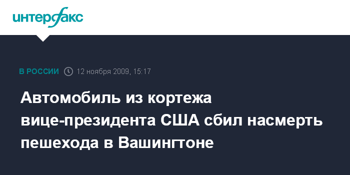 Вашингтон. 12 ноября. INTERFAX.RU - Одна из машин кортежа вице-президента США Джозефа Байдена сбила пешехода в Вашингтоне, сообщает в четверг американский телеканал Fox News. От полученных травм пешеход скончался на месте.