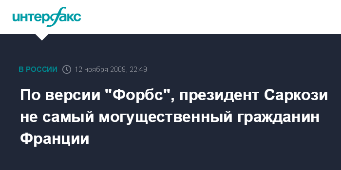 Париж. 12 ноября. ИНТЕРФАКС - Список наиболее могущественных людей в мире, опубликованный американским журналом "Форбс", показывает, что президент Франции Николя Саркози - далеко не самый влиятельный француз на нашей планете, пишет в четверг на своем веб-сайте газета "Фигаро".