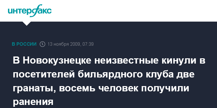 Кемерово. 13 ноября. ИНТЕРФАКС-СИБИРЬ - Двое неизвестных в городе Новокузнецк (Кемеровская область) кинули в посетителей бильярдного клуба две гранаты, в результате инцидента восемь человек пострадали, из них двое в реанимации, сообщил "Интерфаксу" источник в правоохранительных органах Кемеровской области в пятницу.