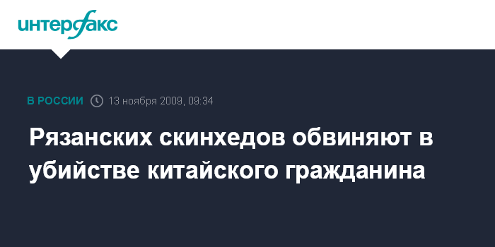 Москва. 13 ноября. INTERFAX.RU – Обвинение в убийстве гражданина Китая было предъявлено четырем участникам группировки "скинхедов" в Рязанской области, сообщили в Следственном комитете при прокуратуре РФ.
