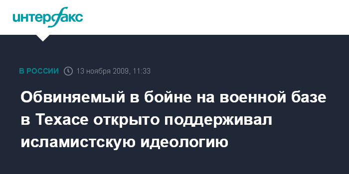 Москва. 13 ноября. INTERFAX.RU – Знакомые майора американской армии Нидаля Малика Хасана, убившего 13 человек на военной базе Форт-Худ в Техасе, заявляют, что он в течение долгого времени отстаивал взгляды исламистских радикалов, сообщает телекомпания CNN.
