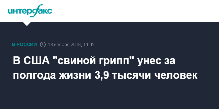 Вашингтон. 13 ноября. INTERFAX.RU - Около 3,9 тысячи человек, из них 540 детей, умерли от вируса A/H1N1 в США с момента начала распространения этого заболевания, сообщает американская телекомпания CNN со ссылкой на заявление Федерального центра по контролю и профилактике заболеваний.
