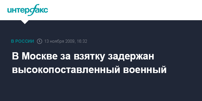 Москва. 13 ноября. INTERFAX.RU - Высокопоставленный сотрудник министерства обороны России задержан в Москве с поличным при получении взятки почти в 1 млн рублей.